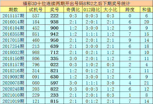 十位号码:前两期十位分别出现奖号8-2,历史上福彩3D连续前后分别开出号码8-2的现象共开出59次。在十位8-2的现象出现时,最近15期其下期分别开出号码:222-938-900-942-950-639-712-335-022-821-630-597-822-233-815;