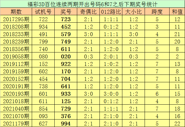 百位号码:连续两期百位出号分别为:6-7,历史上福彩3D连续两期前后分别出号6-7的奖号共出现67次。在百位6-7的奖号现象出现时,近15期下期分别出号:723-452-579-749-611-020-922-170-704-641-933-125-729-376-994;