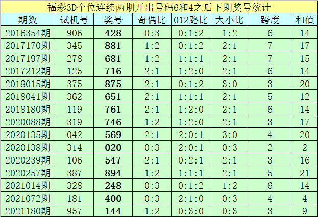 个位号码:最近两期个位开出号码为6-4,在福彩3D历史开奖中,前后两期个位分别开出号码6-4的奖号出现了62次。最近15期个位6-4组合出现之后,其下期奖号分别为:428-881-681-716-875-651-761-746-569-020-547-894-248-400-144;