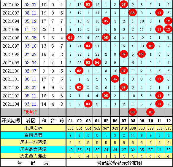 后区号码分析:在前7周星期六开奖中,后区奇偶号码个数比为7:7,奇偶号码走势基本相当,后区大小号码个数比为6:8,大小号码开出个数基本持平,本期后区防全大组合,关注号码08、09、10、12,精选两码08、10。