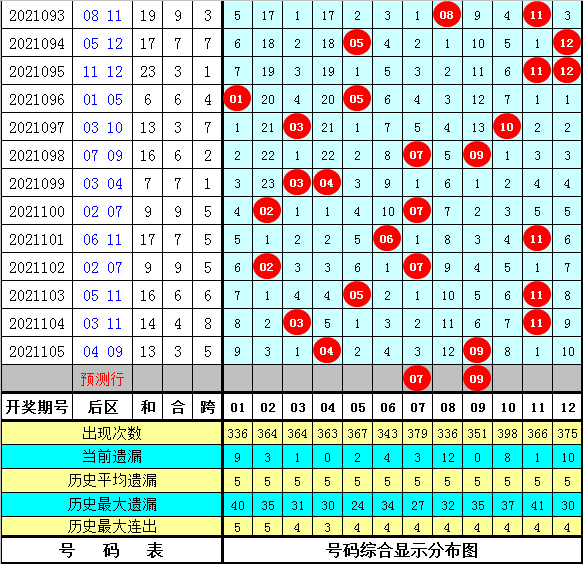 3.在历史同期开奖中,后号码012路比为10:9:7,其中012路号码轮空期数分别为:6期、6期和1期,本期后区012路号码参考1:1:0。