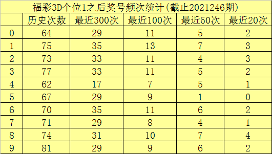 个位杀号:上期个位奖号为1,历史上个位奖号1共开出715次,最近100次个位奖号1出现时,其下期号码0-9开出次数分别为:奖号1开出13次,0、2、3、6开出11次,8开出10次,5、9开出9次,7开出8次,4开出7次。