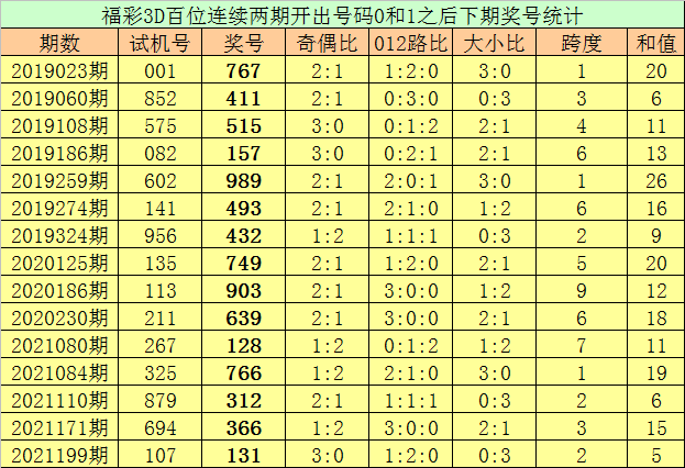 百位号码:连续两期百位出号分别为:0-1,历史上福彩3D连续两期前后分别出号0-1的奖号共出现74次。在百位0-1的奖号现象出现时,近15期下期分别出号:767-411-515-157-989-493-432-749-903-639-128-766-312-366-131;