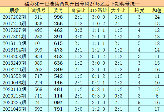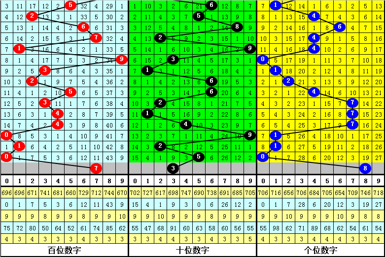十位号码:前两期十位分别出现奖号2-5,历史上福彩3D连续前后分别开出号码2-5的现象共开出67次。在十位2-5的现象出现时,最近15期其下期分别开出号码:996-256-462-391-615-473-452-636-349-542-145-481-114-097-791;