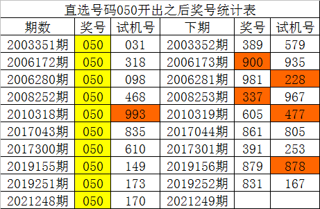 从以上统计可以看出,直选号码050出现之后,其下期奖号:1.下期奇数号码出现概率100%;2.下期大号出现概率100%;3.下期0路号码出现概率100%;
