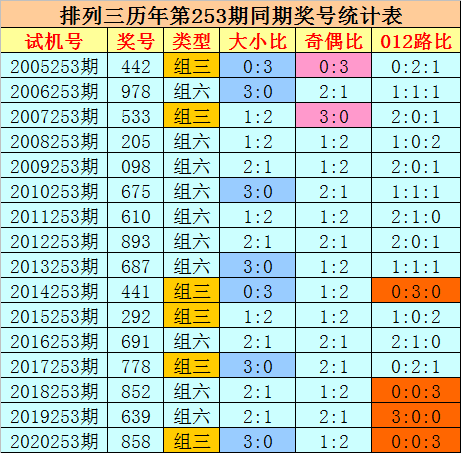 奇偶分析:历史上排列三第253期同期奖号中,奇偶比0:3、3:0出现1期,奇偶比2:1出现6期,奇偶比1:2出现8期,奇偶奖号总比例开出23:25,奇数号码开出较少,今年第253期适当关注奇数号码回补,关注奇偶比2:1。