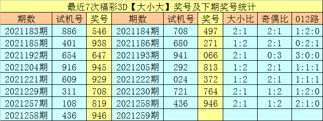 开奖回顾:福彩3D第2021258期试机号为436,奖号为946。奖号为:组六,大小比为2:1,大小类型为:大小大。