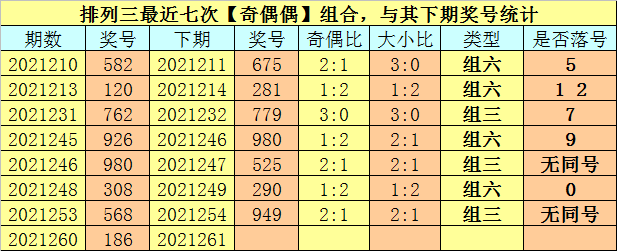 奇偶分析:排列三上期奖号为186,其奇偶类型为【奇偶偶】,最近七次出现奇偶类型奇偶偶的号码分别为:582、120、762、926、980、308、568,其下期奖号分别为:582、120、762、926、980、308、568。其中号码奇偶比为12:9,奇偶奖号开出比例基本相当,本期奇数热出的可能性较大,预计出现2个奇数号码。