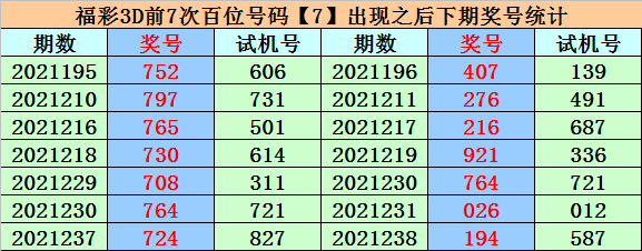 在百位号码7前7次开出之后,其下期分别开出号码:4、2、2、9、7、0、1,其中号码012路比为2:3:2,奇偶比为3:4,大小比为2:5。