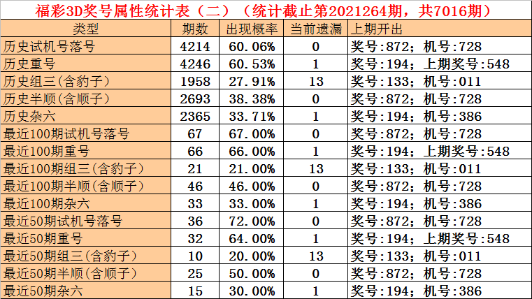 上期奖号:福利彩票3D第2021264期开出奖号872,试机号为728。