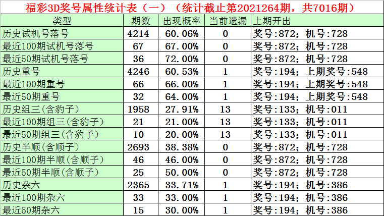 福彩3D第2021264期试机号为728,奖号为872,试机号出号728。从统计表中分析,最近100期试机号出现67期,出现比例为67%,最近50期试机号出现36期,出现比例为72%,最近10期试机号出现 7期,出现比例为70%,本期防止试机号中号码轮空。