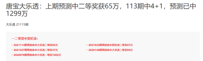 唐宝上期也中二等65万,其同样连续两期中奖,在第21113期预测中他还中4+1,状态同样不俗。回查历史战绩,他曾在20076期命中头奖1002万、20130期命中二等98万、21027期命中二等47万,算上这次中奖,这已是他第4度命中体彩大奖,周六精选方案请及时查看!