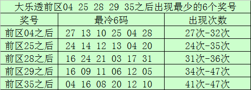 前区号码04开出之后出现次数最少的6码为:27、13、10、25、04、28;