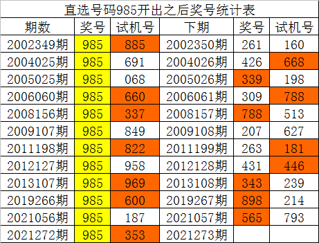 从以上统计可以看出,直选号码985出现之后,其下期奖号:1.下期合数出现概率100%;