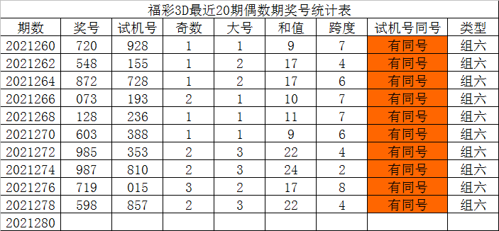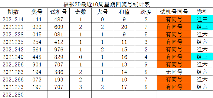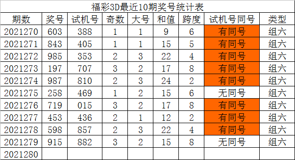 福彩3D第2021280期发哥推荐: