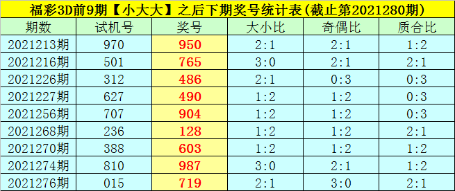 一、上期回顾:福彩3D第2021280期试机号为:200,奖号为:276,奖号类型开出组六,大小比为2:1,奇偶比为1:2,和值为15,跨度为5,012路比为1:1:1。