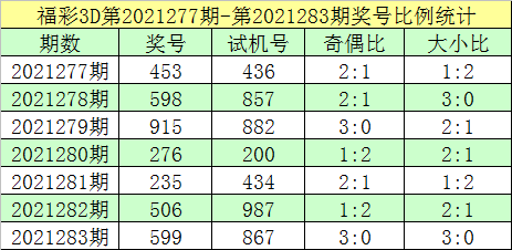 福彩3D第2021283期回顾:奖号为599,试机号为867。奖号奇偶比为3:0,大小比为3:0,和值为23,类型为组三。