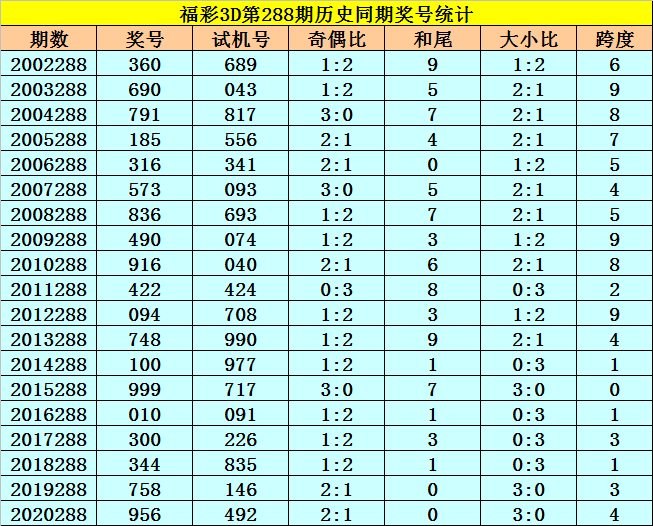 福彩3D历年第288期同期奖号为:360 690 791 185 316 573 836 490 916 422 094 748 100 999 010 300 344 758 956。