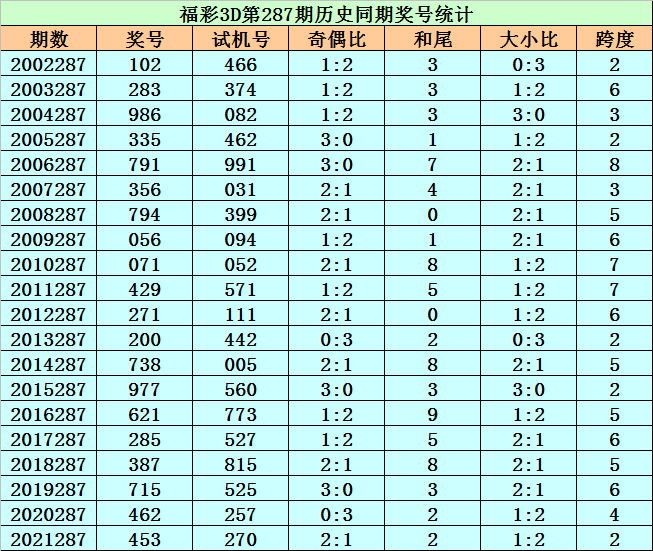 福彩3D历年第287期同期奖号为:102 283 986 335 791 356 794 056 071 429 271 200 738 977 621 285 387 715 462 453。