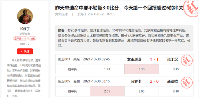 长红丁也是近期通过球通精英引入计划而加入的实力专家。推荐首日他命中那不勒斯赢盘+3-0比分,昨日他再擒超6倍竞彩2串1,单挑命中女王公园3.3倍平局,短短两日便拿下超7倍盈利,长红丁的实力有目共睹!