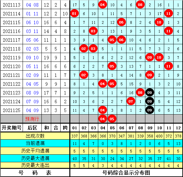 3.在历史同期开奖中,后号码大小比为13:13,其中大号开出0-2个的现象有:3期、7期和3期,本期后区大小比关注0:2;