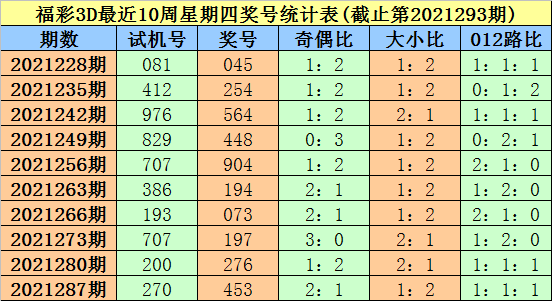 福彩3D第2021287期(上周星期四)试机号为270,奖号为453。其中奖号奇偶比为2:1,大小比为1:2,012路比为1:1:1。