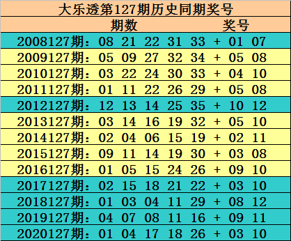 三、连号分析:在第127期历史同期奖号中只有6期出现了连号,分布在第2008127期、第2012127期、第2017127期、第2018127期、第2019127期、第2020127期,出现比例为46%,本期注意连号回补,关注连号19、20。