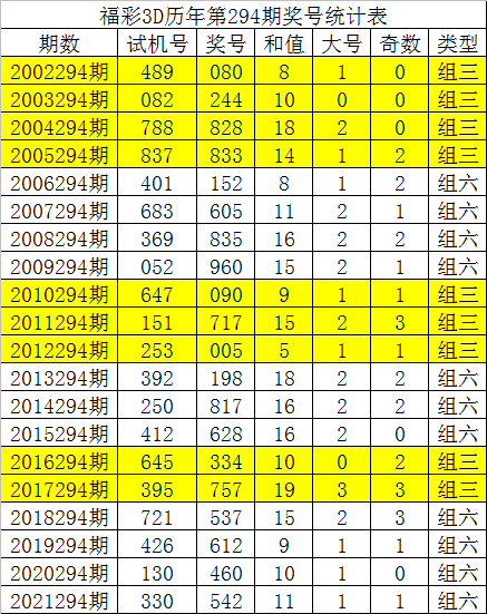 从以上统计可以看出,历年3D第295期开出了1次豹子号码,开出了3次组三号码,开出了15次组六号码。组六号码出现概率大,本期预计开出组六号码。