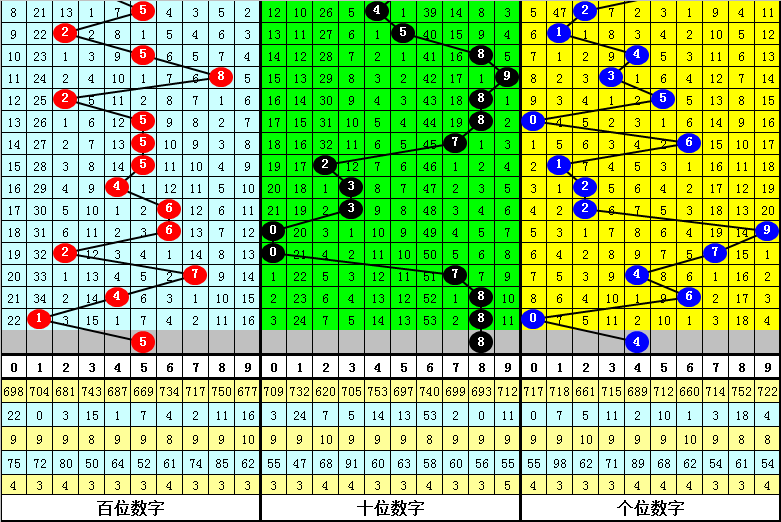 2、号码0-9出现开出频次分别为:号码8出现23次,号码4出现17次,号码0出现16次,号码1出现15次,号码3、7、9出现14次,号码2出现13次,号码5、6出现9次。一般来说,表现最冷的三码:2、5、6不会同时出现,本期杀一码:2;表现最热的四码:0、1、4、8中一般会出现奖号,本期注意号码;8。