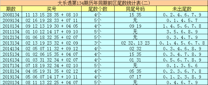 大乐透历年同期第134期后区尾数大小比为10:16,尾数奇偶比为11:15,本期后区大范围参考01、02、03、05、07。