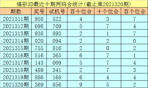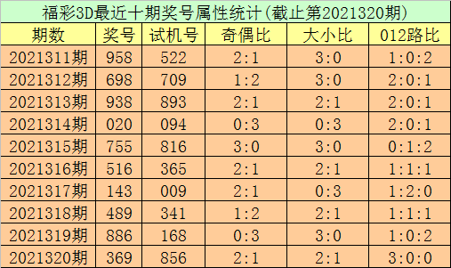 开奖回顾:第2021320期福彩3D试机号为856,奖号为369。奖号形态为组六,大小比为2:1,和值为18,奇偶比为2:1,012路比为3:0:0,跨度为6。