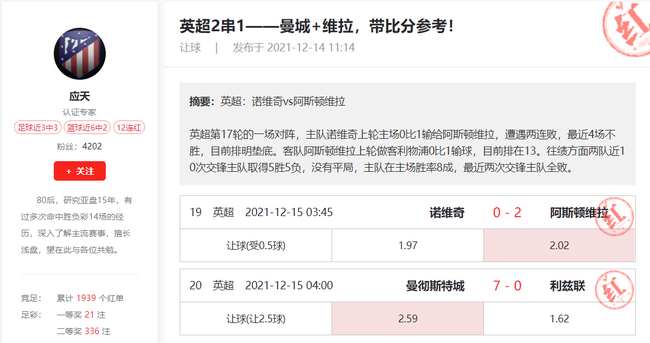 应天昨日状态爆棚,4单2串1成功打出3单,昨单日盈利575%!其中曼城穿盘+维拉不败一单回报高达356%,专家应天今日5单串关已发,都为英超+德甲的焦点赛事,值得关注!