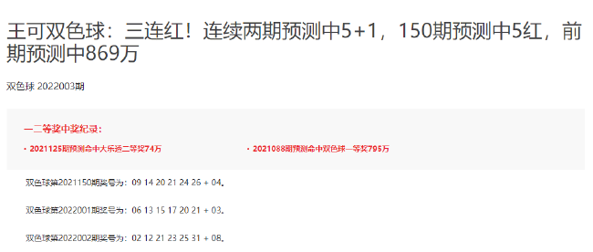 专家王可连续命中双色球5+1/5+1/5红!