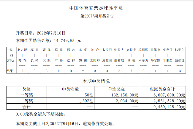 北京时间7月18日,胜负彩第22077期开奖结果揭晓。本期一等奖开出50注,单注奖金13万余元;二等奖开出1392注,单注奖金2034元;任选9场开5390注,单注1819元。本期胜负彩销量为14,749,554元,任九投注总额为15,325,140元。