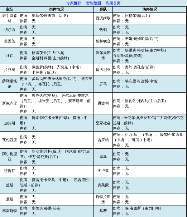 伤停点评:本期足彩由英超、德甲、西甲、意甲和法甲组成。英超赛场,诺丁汉森与西汉姆联各有一名后卫因伤缺阵,有意思的是,两名球员都身披27号球衣。切尔西与热刺的伦敦德比之战,双方均可全主力出战;德甲赛场,拜仁慕尼黑格雷茨卡依旧伤缺,此轮德甲为科曼禁赛的最后一场,不出意外下轮德甲将迎来复出;意甲赛场,拉齐奥两名球员受伤,外加一名球员停赛,反观博洛尼亚只有小将奥孔古不能出战。萨勒尼塔纳中后场共3人高挂免战牌;西甲赛场,阿尔梅里亚3后卫伤缺,对上全员健康的皇马无疑是雪上加霜。皇家社会进攻核心+头号射手奥亚萨瓦尔无法出战,进攻火力定会受到一些影响;法甲赛场,马赛主力守门员保-洛佩斯受伤,除此之外,其余各队均未遭受严重伤病。