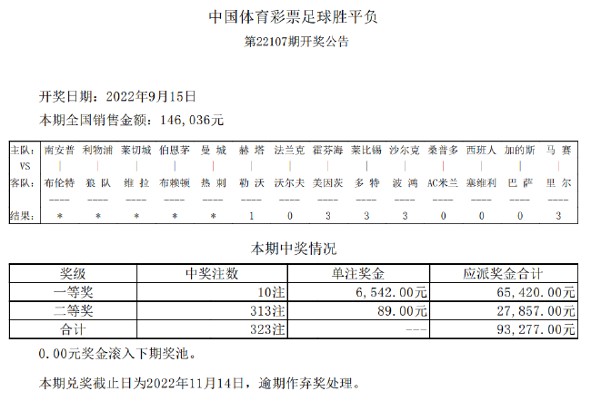 北京时间9月15日,足彩第22107期开奖结果揭晓。本期14场1等开出10注6542元,2等开出313注89元,任九则开出2959注46元。本期胜负彩销量为146,036元,任九投注总额216,330元。
