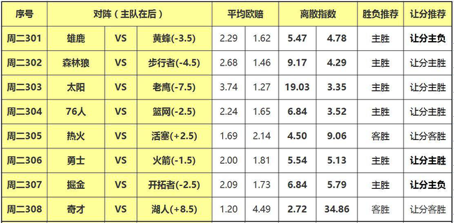 两队目前战绩完全一样,分列西部第八和九位,本场直接对话可能直接决定季后赛争夺走势,但虽然开拓者气势更胜,但掘金综合实力可能稍占上风。而本场欧赔均值目前稳定在2.10-1.72,优势给到开拓者一方,让分盘则开出主让-2.5分浅盘,盘口对开拓者较为不利,双方前三场交手掘金2胜1负,分别在各自主场获胜,掘金上次残阵造访波特兰,盘口开到主让-7.5分,开拓者6分险胜上盘并未打出。本场离散值较为诡异,目前主胜离散5.79指数偏高,客胜指数稍有上升,目前稳定在6.84,本场主胜支持度明显不足,让分盘建议博下盘让分主负为好。