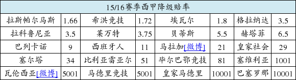 新赛季的三支升班马中,拉斯帕尔马斯与希洪竞技实力孱弱是新赛季西甲降级的最大热门。目前两队的降级赔率分别为1赔1.66、1赔1.72,分列降级榜前两位。