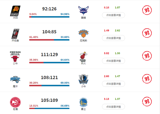 今日命中的5场比赛,其中最为惊险的竟然是勇士主场打老鹰。本场比赛,赛前预测给出勇士赢球的概率为86%,最终,卫冕冠军却苦战到加时,才惊险拿下对手。原来,本战库里和伊戈达拉同时缺阵。临场缺战消息才得以确认,的确令人猝不及防。