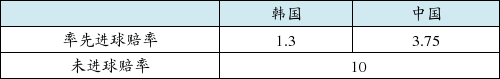 本场比赛,韩国率先进球的赔率为1赔1.3,国足为1赔3.75,双方都未能取得进球的赔率是1赔10。单从赔率上看,韩国队会在主场率先取得进球的几率远高于国足。