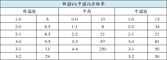 比分赔率:韩国1-0小胜国足