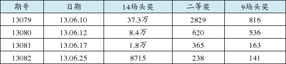 在2013年曾连续四期任九开出“火锅奖”,巧合的是,这四期足彩也都是由世界杯预选赛所组成。13079期由世欧预以及巴甲组成;13080期由世亚预、世欧预以及世南美预组成;13081期由非洲区预选赛组成;13082期由世非预以及俄超组成,四期预选赛中并未出现明显的冷门,顶多出现一至两场冷平,与近四期的开奖极为相似。这不禁令我们想到下一期的开奖会是如何呢?小编查到13083期14场比赛出现6场平局,全国仅中出一注胜负彩头奖,奖金高达453万,任九达5477元,如此反差令彩民防不胜防。