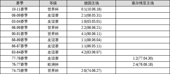 德国VS塞尔维亚两队历史上交战过28场,德国16胜4平8负。在 世界杯中两队交手7次,德国4胜1平2负,进11球失5球,其中主场胜4场平1场负1场,进球11球失4球。 友谊赛中两队交手18次,德国10胜3平5负,进31球失24球,其中主场胜7场平3场负2场,进球20球失13球。 欧洲杯中两队交手1次,德国1胜0平0负,进4球失2球,其中主场胜0场平0场负0场,进球0球失0球。 欧预中两队交手2次,德国1胜0平1负,进3球失2球,其中主场胜1场平0场负0场,进球3球失1球。