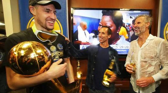 躲在欢庆的人群背后,史蒂夫·纳什作为勇士队的球员发展顾问矜持地庆祝着,怀抱着杜兰特刚刚拿到的那座总决赛MVP奖杯,纳什偷偷地亲吻了一下。