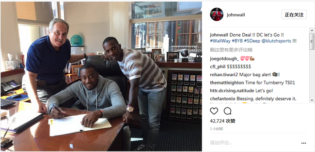 今天,沃尔还在IG上晒出了一张他和奇才队续约的照片,他的经纪人里奇-保罗也在身边。