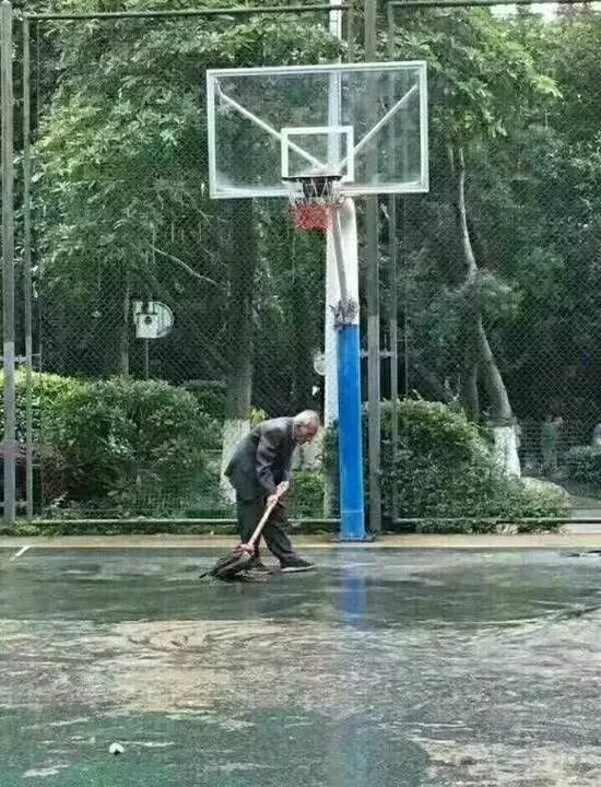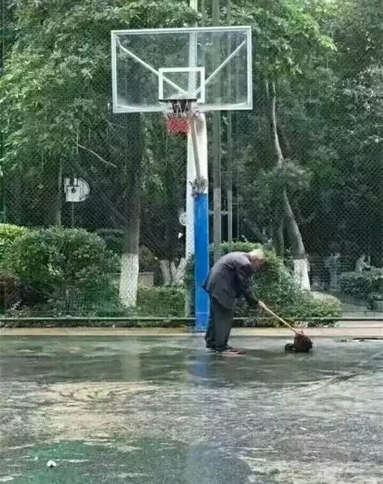 阴雨天,篮球场,扫水的男人。
