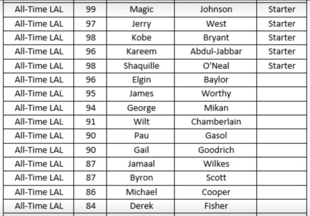 今天,另外7位湖人队史最佳阵容的球员也被公布出来,他们分别是:埃尔金-贝勒(96)、乔治-麦肯(94)、盖尔-古德里奇(90)、贾马尔-威尔克斯(87)、拜伦-斯科特()、迈克尔-库珀(86)和德里克-费舍尔(84)。