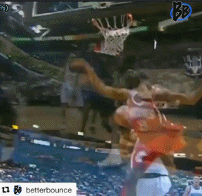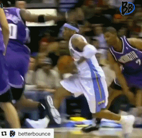 2007-2008赛季,当时在丹佛掘金队的艾佛森突破后强势隔扣国王队贾斯丁-威廉姆斯,后者本想封盖矮小的AI,却没有想到AI完全舒展,劈扣将球扣进篮筐。同时这张动图中也包含了艾佛森快攻中双脚起跳双手扣篮的情形。