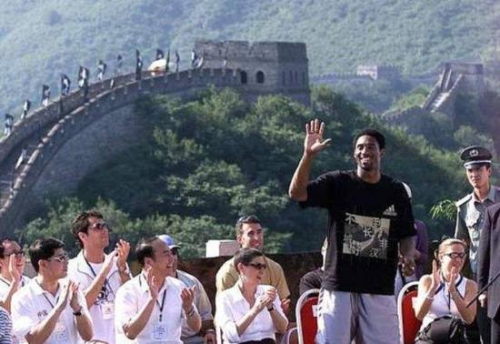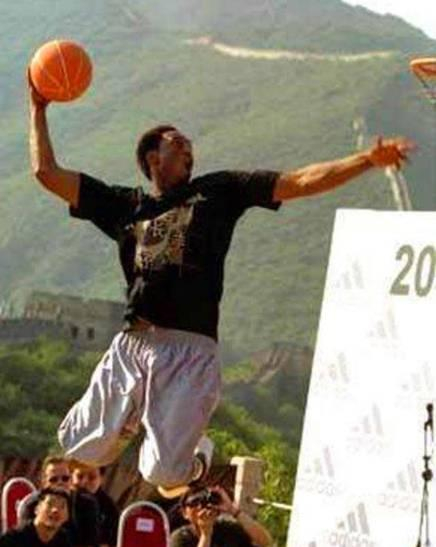 意气风发的科比在长城上大秀花式扣篮技巧,成为了历史上第一个在长城上完成扣篮的人。