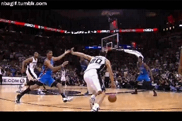 篮球场上的艺术大师,马努-吉诺比利将篮球演绎成了自我表演的个人秀。这一次吉诺比利突破过掉雷霆小将塞弗洛萨,一个传球假动作将凯文-杜兰特晃开。镇守篮下的伊巴卡和帕金斯也都没来得及反应,马努轻松上篮完成得分。